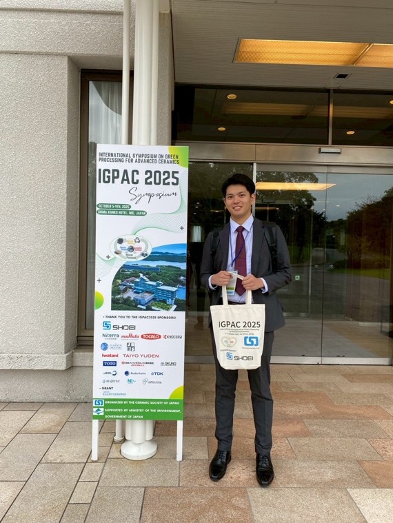 卓越大学院プログラムGD5年 味田渉さん(中山研、室蘭工業大学出身)が2025年10月5日から10月9日に三重県の伊勢志摩で開催された、International symposium on Green Processing for Advanced Ceramics (IGPAC) 2025に参加しました。本国際会議は、資源・環境負荷の低減に貢献する無機材料の非平衡プロセスと応用技術に焦点を当て、その基盤となる科学的・技術的知見を議論する国際シンポジウムとして開催されました。研究成果について学会発表を行い、国内外の研究者に対して自身の研究の意義と進捗を説明し、発表後には、参加者との間で具体的なデータや実験手法に関する質疑応答が活発に行われ、今後の研究推進に向けた貴重な示唆を得ることができました。国際的な研究交流の場に参加し、最先端の知見を得るとともに、自らの研究を発信できたことは、今後の研究活動に大きく寄与する経験となりました。