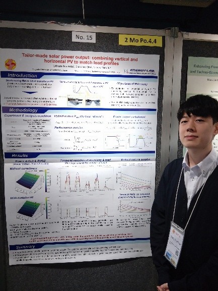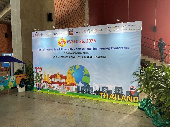 卓越大学院プログラムGD5年 土田脩斗さん(山田研、長岡高専出身)が、2025年11月9日から11月14日までタイのバンコクで開催されたThe 36th International Photovoltaic Science and Engineering Conference(PVSEC-36)に参加し、情報収集を行うとともに、 「Tailor-made solar power output: combining vertical and horizontal PV to match load profiles」と題する研究発表を行いました。発表では、垂直両面型太陽光発電システムと水平単面型太陽光発電システムを組み合わせ,発電プロファイルを電力需要の時間変動に応じて最適化する「負荷適合型PVシステム」の可能性について報告しました。