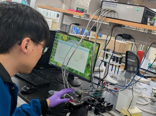 卓越大学院プログラムD3の岡田瞬さん(庄司研、米子高専出身)が2025年8月21日~9月5日にシンシナティ大学(オハイオ州、アメリカ)において、「細胞外ATP検出を目指したマイクロ流体システムの開発」というテーマで海外発展リサーチインターンシップを実施しました。実習では、共同研究先の独自技術であるマイクロ金電極と我々の研究室で開発した細胞捕捉用マイクロ流路を組み合わせ、ATP検出実験を行いました。